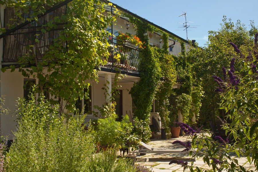Den stora balkongen som sträcker sig över hela gatufasaden är även den vackert dekorerad med blommor och trämöbler.
